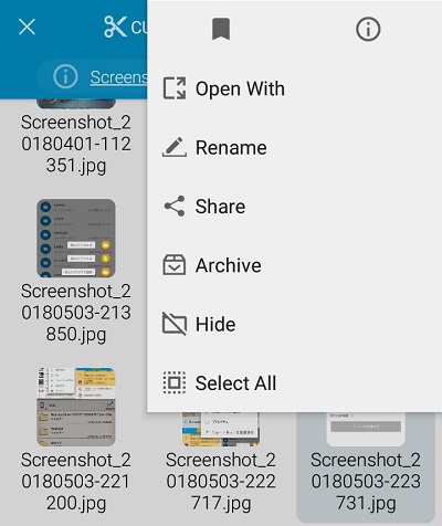 ファイルをタップして長押しすることで画面上部にメニューが表示され、切り取り・コピー・削除を行うことができます。
