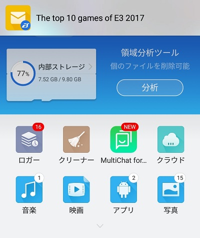 ホーム画面ではロガー・クリーナーなどの機能ボタンのほかに、「音楽」「写真」などの分かりやすいファイルボタンもありますね。