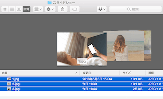 Finderで一つのフォルダに写真をまとめておくと扱いやすいです。今回は3枚のjpg画像をスライドショーで流すことにします。