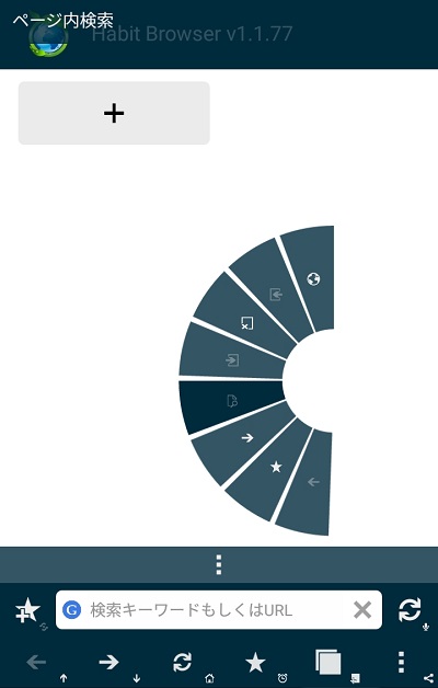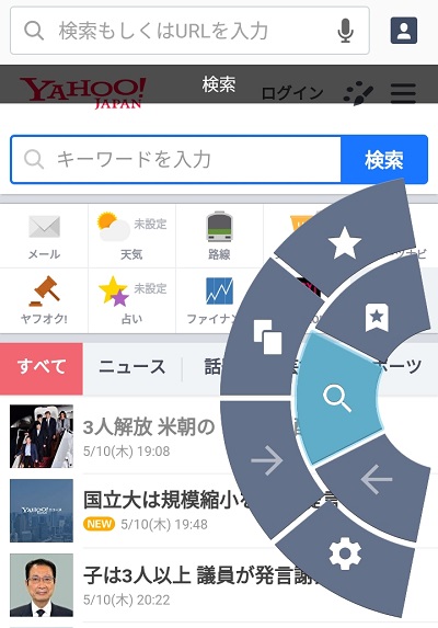 画面をスワイプするだけでタブを切り替えられるのですが、画像のように他のタブをそのままスライドさせて持ってくることができるため直感的に操作しやすく、ブラウジングに必要な機能が画面下部に揃っており、ジェスチャ機能も備えているのでキャッチフレーズ通りに片手だけで十分に操作を行うことが可能です。