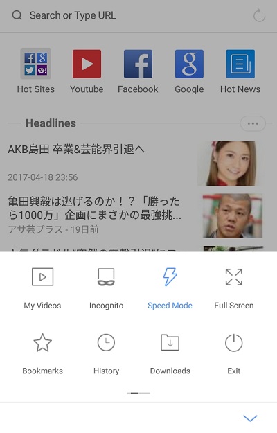 ブラウザはシンプルかつスタイリッシュなUIで、スピードモードやインコグニートは設定メニューから切り替えることが可能となっています。