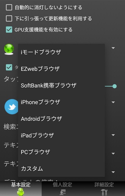 このブラウザの凄い所はオプションメニューです。非常に大量の設定項目が存在しており、テキストからスクロール、通信方式やUser Agentなどかなり細かくブラウザの動作を設定することが可能です。