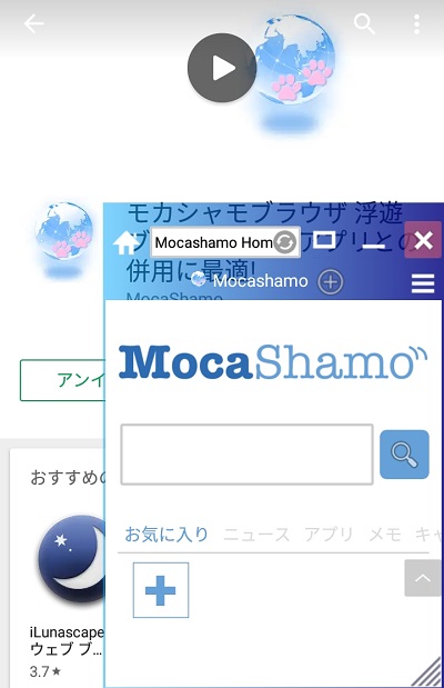 PCのブラウザのようにウィンドウサイズを変更して、フローティングさせてホーム画面に設置できるブラウザが「モカシャモブラウザ」です。