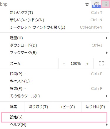 まずはChromeの画面右上にあるメニューボタンをクリックして表示されるメニューの「設定」をクリックしましょう。