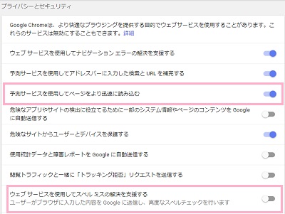 「予測サービスを使用してページをより迅速に読み込む」を有効にすることで、アクセスしたページにあるリンクの中から次に移動するであろうページを予測して事前に読み込むことでブラウジングを速くすることができます。