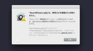 「“Soundflower.pkg”は、開発元が未確認のため開けません。」というエラーメッセージが表示されるので、「OK]ボタンをクリックします。