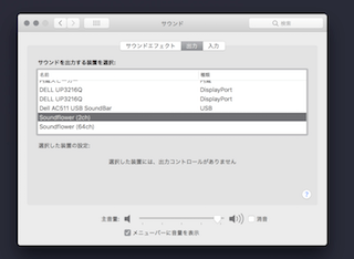 インストールが完了するとシステム環境設定のサウンドの出力タブにSoundflowerが追加されています。