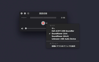 中央の録画ボタン右側の下矢印よりSoundflower(2ch)を選択します。