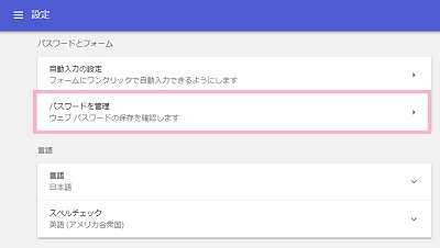 設定メニューに移動したら、最下部にある「詳細設定」をクリックして開き、パスワードとフォームの「パスワードを管理」をクリックしましょう。