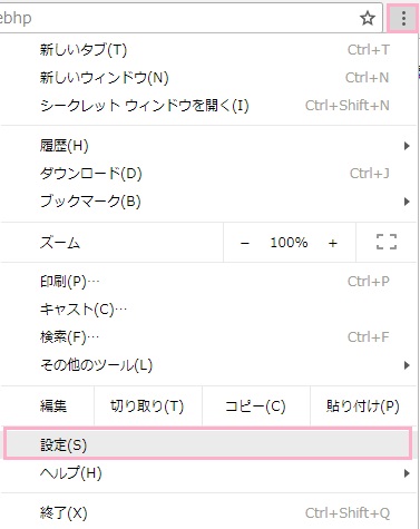 再起動後、Chromeの画面右上に表示されているメニューボタンをクリックして表示されたメニューの「設定」をクリックします。