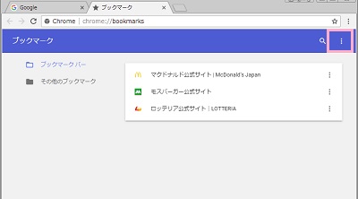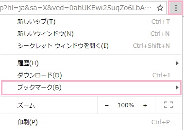 Chromeの画面右上に表示されているメニューボタンをクリックし、メニューの「ブックマーク」にマウスカーソルを合わせましょう。
