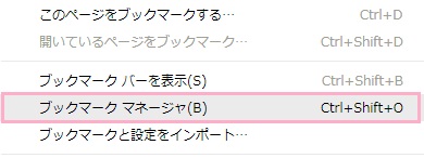 Chromeの画面右上に表示されているメニューボタンをクリックし、メニューの「ブックマーク」にマウスカーソルを合わせると表示されるメニューの「ブックマークマネージャ」をクリックしましょう。