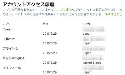 アカウントにアクセスした時間・アプリ・IPアドレス・国がわかるアクセスログが表示されるので、他人が不正ログインしたかどうかを確認できるようになっています。