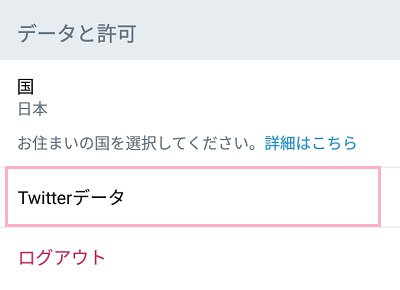アカウントメニューの下のほうにある項目「データと許可」の「Twitterデータ」をタップしましょう。