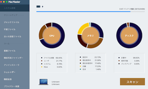 FonePaw MacMasterを立ち上げると上記の画像のような画面が表示されます。左側に各機能が使えるメニュー、右側には最初CPUやメモリ、ディスクの使用量などが表示されています。