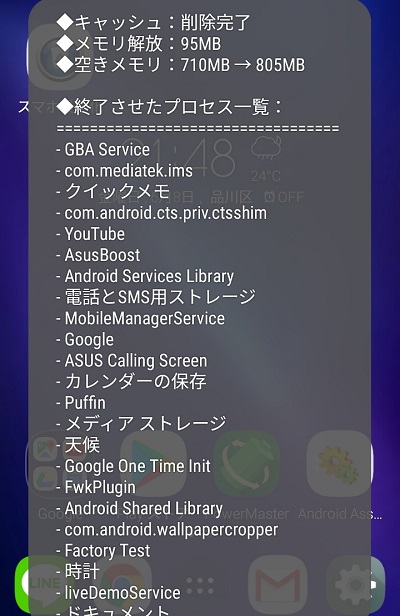 処理結果に表示されるのはキャッシュ・メモリ開放・空きメモリ・終了させたプロセスの一覧のみとスマートな構成になっています。他2つのアプリと比べると処理が爆速なので、他の機能はいらない・タスクキルができればいいという人向けのアプリとなっています。