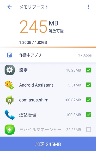 作動中のアプリを自動でスキャンして表示してくれるので、タスクキルしたいアプリをタップして選択したら画面下部の「加速」ボタンをクリックすることでタスクキルが行われます。