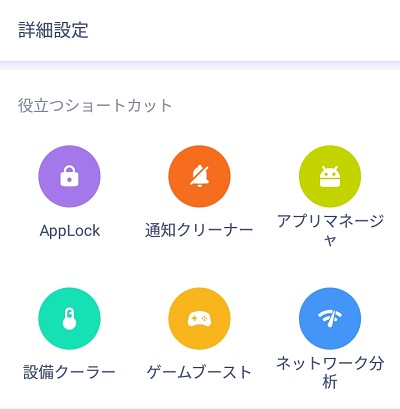 詳細設定メニューには、個人情報を保護するApplock・不要な通知を遮断する通知クリーナー・ゲームを起動する際にタスクキルを行いメモリの容量を確保するゲームブーストなどの便利機能が用意されています。