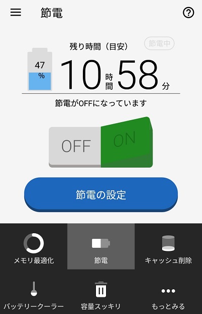 Yahoo!スマホ最適化ツールを起動すると、画面上部に大きくバッテリーの残り残量と時間が表示されておりスマホの稼働時間が分かりやすいです。また、節電ボタンをタップしてON・OFFを切り替えることですぐに節電モードにすることができます。