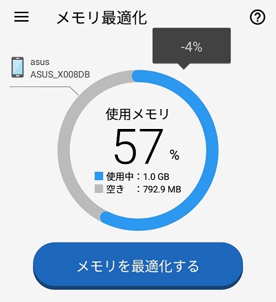 メモリの使用状況がグラフで表示されるので分かりやすいですね。「メモリを最適化する」をタップすると、自動でタスクキルが行われてメモリの空き容量を確保してくれます。