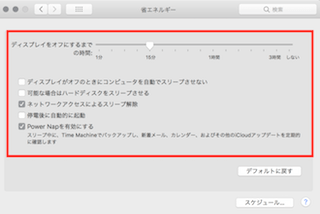 - 「Power Napを有効にする」をチェックするとPower Napの間はディスプレイと実行されるタスクに必要のないハードウェアの電源が切られ節電効果があります。スリープ中に定期的にスリープが解除され、メールチェックやソフトウェアアップデートなどのタスクが実行されます。