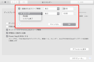 - 「停電後に自動的に起動」をチェックすると、停電になったときや電源コードが外れてしまった場合に電源に再接続されるとMacが再起動します。