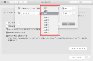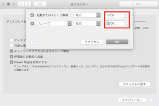 こちらのスケジュールから起動またはスリープ解除とスリープ開始の時間を設定することができます。