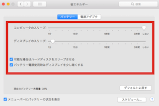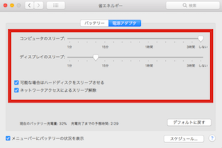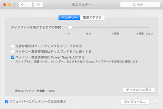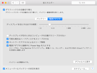 ノート型のMacはバッテリー駆動時と電源アダプタ接続時の設定を変更できるようになっているのと、Retina搭載機にはPower Napの設定ができるようになっています。