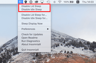 メニューの上段2つの「Disable Lid Sleep」と「Disable Idle Sleep」にチェックを入れます。