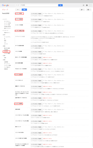 「メンバーの追加」、「メンバーを承認」、「ユーザーを禁止する」、「メンバーを招待」、「メンバーを変更」は初期設定ではグループのオーナー、グループのマネージャーが行えますが、全てのメンバーが行えるように変更することが可能となっています。