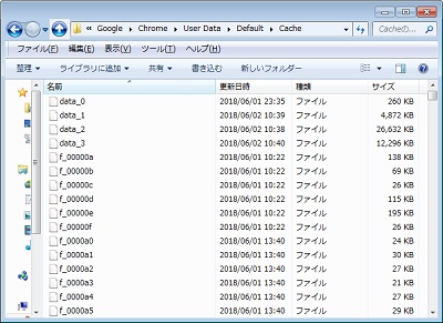 ただし、Chromeの場合キャッシュフォルダの内部はこのようにファイル名が分からず判断しにくい状態になっています。