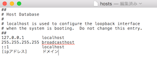 テキストエディットで追加するIPアドレスとドメインのセットを記述し、保存をしましょう。