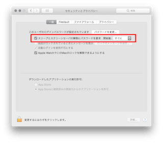 「一般」パネルの「スリープとスクリーンセーバーの解除にパスワードを要求」のチェックボックスにチェックを入れ「開始後:」「5分後に」という欄を「すぐに」に変更します。