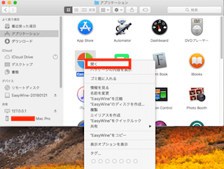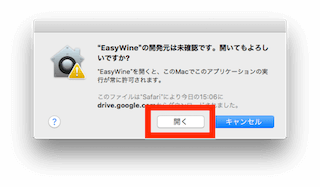 「”EasyWine”の開発元は未確認です。開いてもよろしいですか?」というウィンドウが表示されますので開くをクリックします。