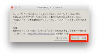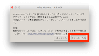 「wine-monoパッケージが見つけられませんでした。」というウィンドウが表示されますので、「インストール」ボタンをクリックします。