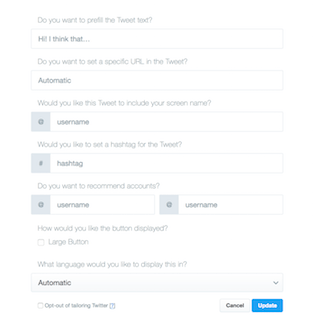 TwitterのシェアボタンはTwitter公式の以下のサイトから生成することができます。最終的にはhtmlタグとして、コピペすることができます。