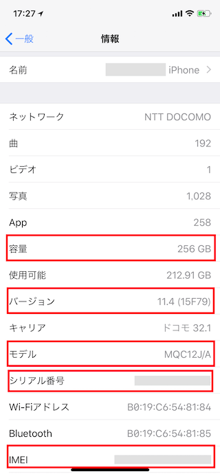 こちらの情報画面のモデルの部分に製品番号、バージョンにiOSのバージョン、容量欄に本体容量、シリアル番号、IEMIが記載されています。