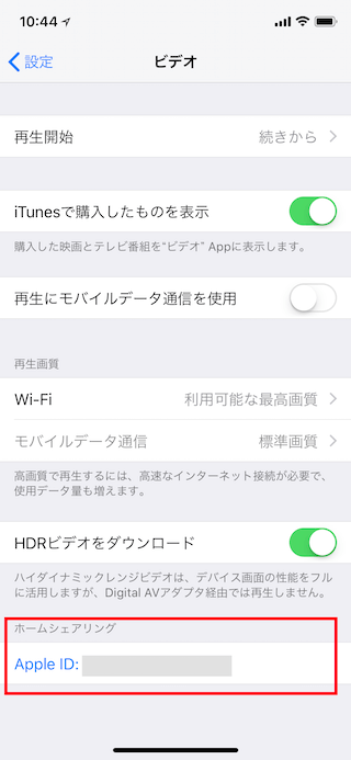 iPhoneの場合は「設定」>「ミュージック」または「ビデオ」 >「ホームシェアリング」に表示されているApple IDです。