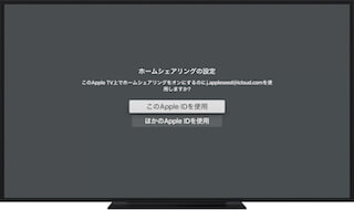 Apple TV 4KまたはApple TV(第4世代)では「設定」>「アカウント」>「ホームシェアリング」で表示されているApple IDです。