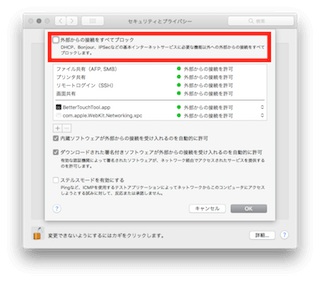 外部からの接続をすべてブロックしていないか、または重量なサービスに限り接続を許可している場合は設定を編集します。