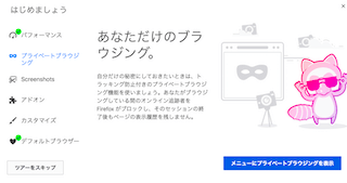 Firefoxでは新しいタブを開き、左側にある狐のアイコンをクリックすることで、Firefoxの使い方を知ることができるツアーをはじめることができます。