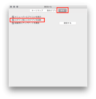 「設定」パネルを選択して、「ログイン後にこのアプリを起動」にチェックが入っているかを確認します。