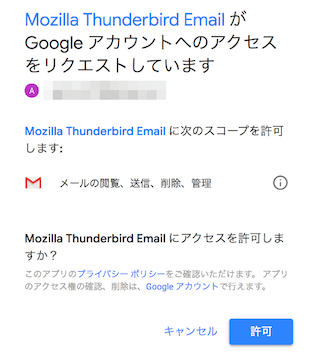 自分のGmailのアカウント情報を入力すると、Thunderbirdに許可を与える画面になります。
