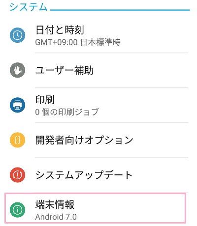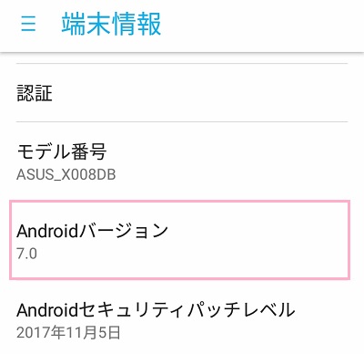 端末情報メニューが開いたら「Androidバージョン」の項目でタップを連打しましょう。