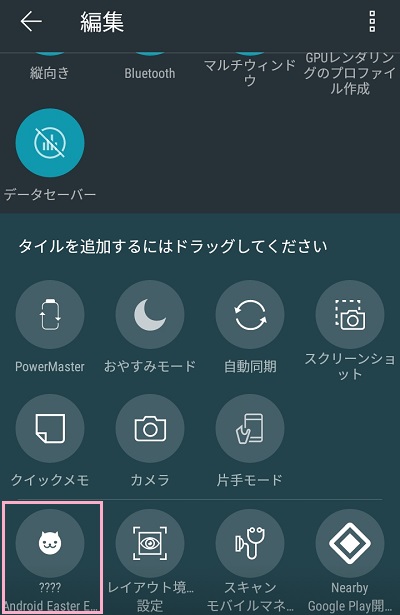 クイック設定メニューの「編集」をタップすると、カスタマイズアイコン一覧に「???? Android Easter Egg」が追加されているので、これをドラッグしてクイック設定メニューに追加すればOKです。