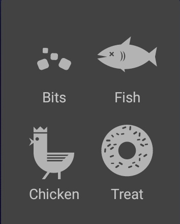 「Bits」「Fish」「Chicken」「Treat」の4つのエサの中から、皿に置くエサを選択しましょう。