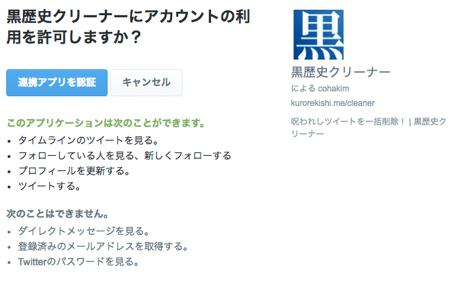 ・開始時 「ツイ消しせねばっ =͟͟͞͞(๑•̀ㅁ•́ฅ✧ | 呪われしツイートを一括削除! 黒歴史クリーナー - http://kurorekishi.me/cleaner #黒歴史クリーナー」