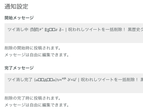 ・完了時 「ツイ消し終わった (๐ ́꒪̐ꈊ͒꒪̐)ꐳ | 呪われしツイートを一括削除! 黒歴史クリーナー - http://kurorekishi.me/cleaner #黒歴史クリーナー」 というメッセージが設定されています。