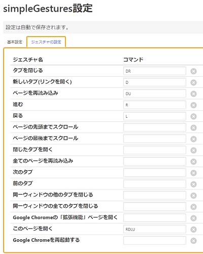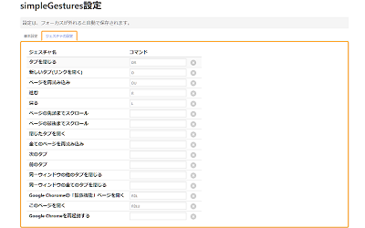 「simpleGestures」はminiGestures同様にブラウザに必要な機能だけを揃えたマウスジェスチャーですが、あちらは英語表記オンリーなのに対してこちらは日本語をサポートしているので、英語が苦手なユーザーにはこちらのマウスジェスチャーがおすすめです。