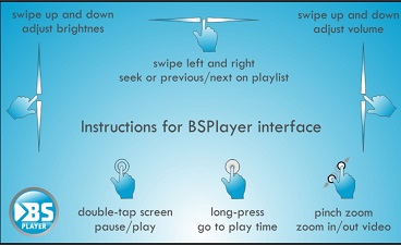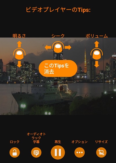 初回起動時には使い方のTipsが表示されます。他のビデオプレイヤー同様に、左右にスライドすることでシークバーを表示・画面の左側で上下にスライドすると明るさの調節・画面右側で上下にスライドするとボリューム調節が行えます。また、動画の再生時に画面上部に広告が出ることがあります。